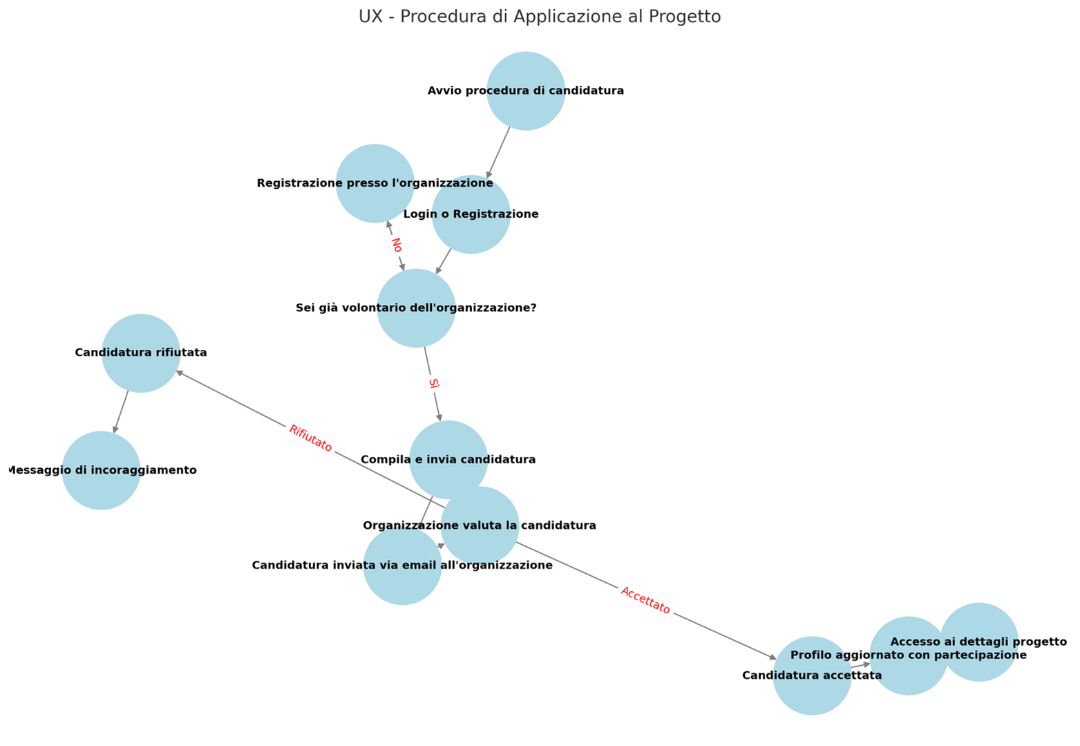 In fase di applicazione al progetto all’utente viene richiesto di registrarsi sulla piattaforma o di fare login. Successivamente al login verrà chiesto se l’utente è già volontario dell’organizzazione che promuove il progetto. Se sì, si potrà procedere alla domanda di applicazione. Se no, si rimanderà al link della pagina di registrazione a volontario presente sul sito dell’organizzazione. Una volta accertato che l’utente sia volontario dell’organizzazione promotrice del progetto gli sarà possibile inoltrare la propria candidatura. La candidatura verrà inoltrata per email all’indirizzo dell’organizzazione promotrice che con un tasto potrà accedere all’applicazione dell’utente, e validarla. La validazione dell’applicazione prevede l’accettazione della domanda di partecipazione o il rifiuto della domanda.